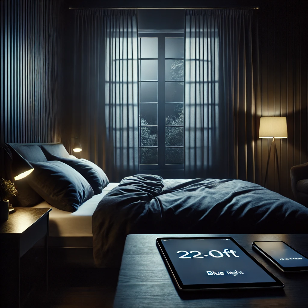 숙면을 취하려면 침실에 들어오는 외부 빛을 차단하는 것이 중요하다. 가로등이나 자동차 헤드라이트 등 외부에서 유입되는 빛이 수면의 질을 떨어뜨릴 수 있기 때문이다. 이를 막기 위해 커튼이나 블라인드 등을 사용하여 침실을 어둡게 유지하는 것이 필요하다. 특히, 휴대폰, 컴퓨터, 태블릿 등에서 나오는 청색광도 수면에 방해가 되므로 잠자기 전에는 이러한 전자기기의 사용을 자제하는 것이 좋다. 뉴욕 알버트 아인슈타인 의대 연구팀은 침실에서 사용하는 조명이 주황빛이면서 어두운 환경을 조성하는 것이 수면을 도울 수 있다고 강조한다.