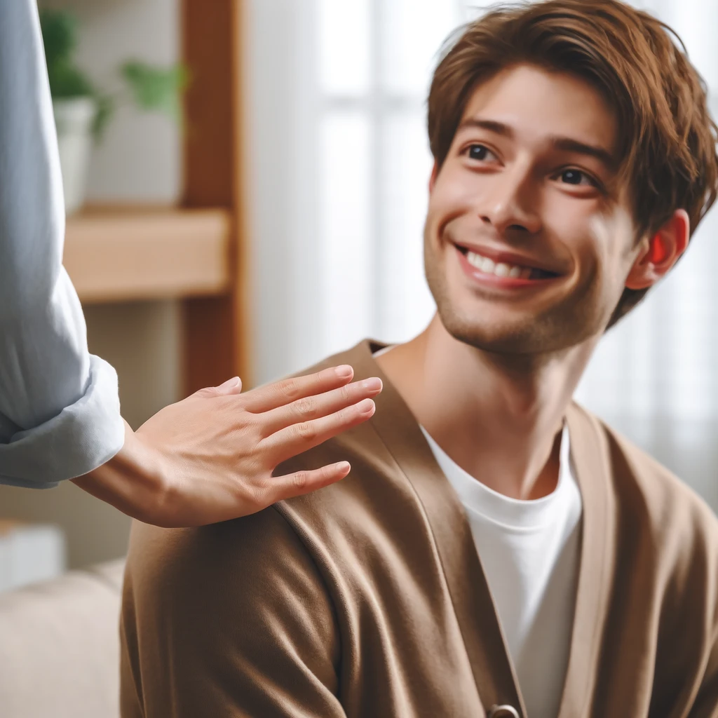 사진 2: 덕담의 실천 이 사진은 한 사람이 친구에게 덕담을 건네는 장면을 담고 있다. 따뜻한 말 한마디로 친구의 얼굴에 미소가 번지는 모습은 덕담의 힘을 잘 보여준다.
