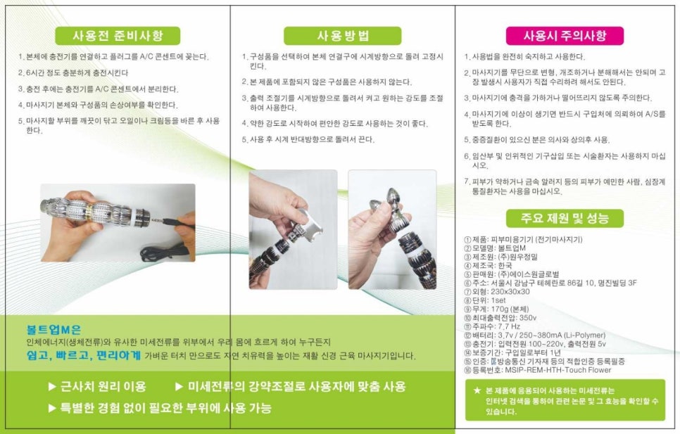 따라서 보다 구체적이고 자세한 제품의 구성 성분과 기능, 그리고 사용방법에 대해서는 이 마사지기를 직접 사용해 본 분이나 미세전류 전문가에를 통해 보다 더 정확한 정보를 알아보는 것이 좋을 것이다.