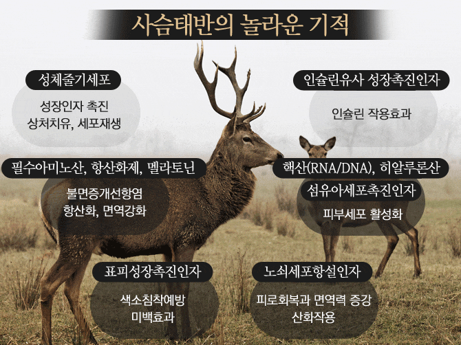 사슴 태반에는 성장인자, 면역체계, 아미노산, 각종 비타민 등의 성분이 풍부하게 함유되어 있어 인체의 자연치유력을 높이고 활성산소 제거, 활력증진과 노화예방 등에 도움을 준다고 한다.