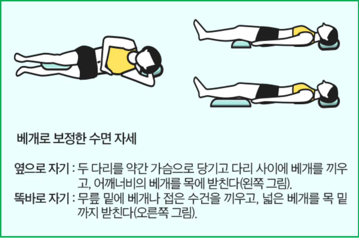 - 등 또는 옆으로 자는 것이 선호되며, 무릎과 목을 지지하는 베개 사용이 중요