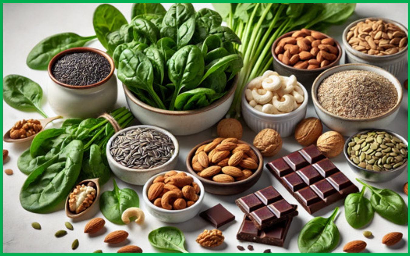 2. 짙은 녹색 잎 채소: 시금치, 케일, 근대 등은 마그네슘을 다량 함유하고 있다. 이들은 비타민 K와 철분도 함께 제공하여 뼈 건강을 증진시킨다.
