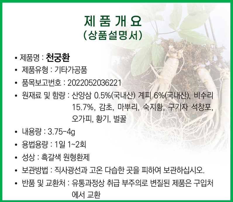 천궁환에는 7년생 산양삼, 계피, 비수리(야관문), 감초, 마뿌리, 숙지황, 구기자, 석장포, 오가피, 황기, 벌꿀 등이 포함되어 있다. 이들 성분은 각각 다양한 건강 효능을 가지고 있다.