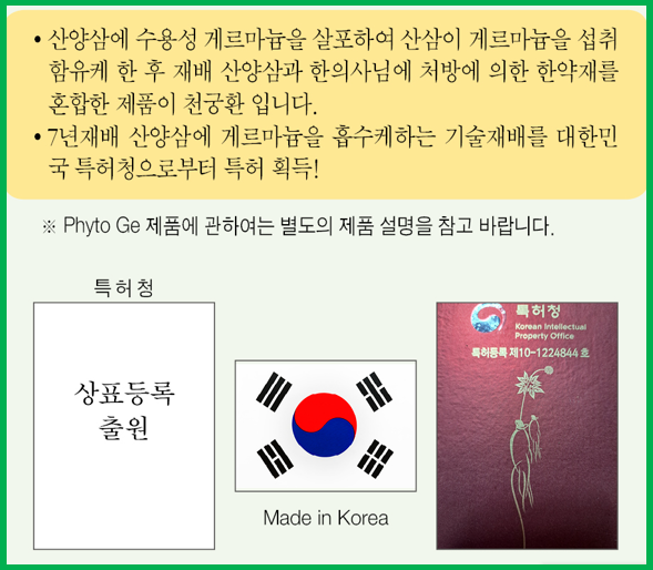 한국의 산삼은 지구상에서 약성이 가장 뛰어난 식물로 알려져 있다. 특히 약성 있는 산삼은 100뿌리 중 2~3뿌리 정도로 귀한 편이다. 산삼에 게르마늄 함유량이 높아지면 알칼로이드 성분과 Rb1, Rg1, Rg3 성분도 증가해 건강에 큰 도움이 된다.