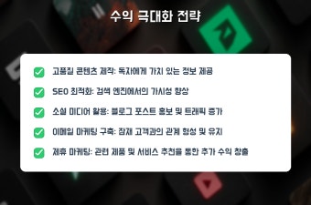 광고 수익만 의존하면 불안정합니다. 추천 전략은 3축 수익 모델입니다. 1) 광고·네이버 애드포스트, 2) 제휴·상품 리뷰와 제휴 링크, 3) 디지털 제품·유료 구독(이북, 강의, 템플릿). 초반에는 제휴·디지털 제품에 집중해 마진을 확보하세요. 구독 모델은 콘텐츠 품질과 이메일 리스트가 확보된 후 실행하면 전환율이 높습니다. 💰📬